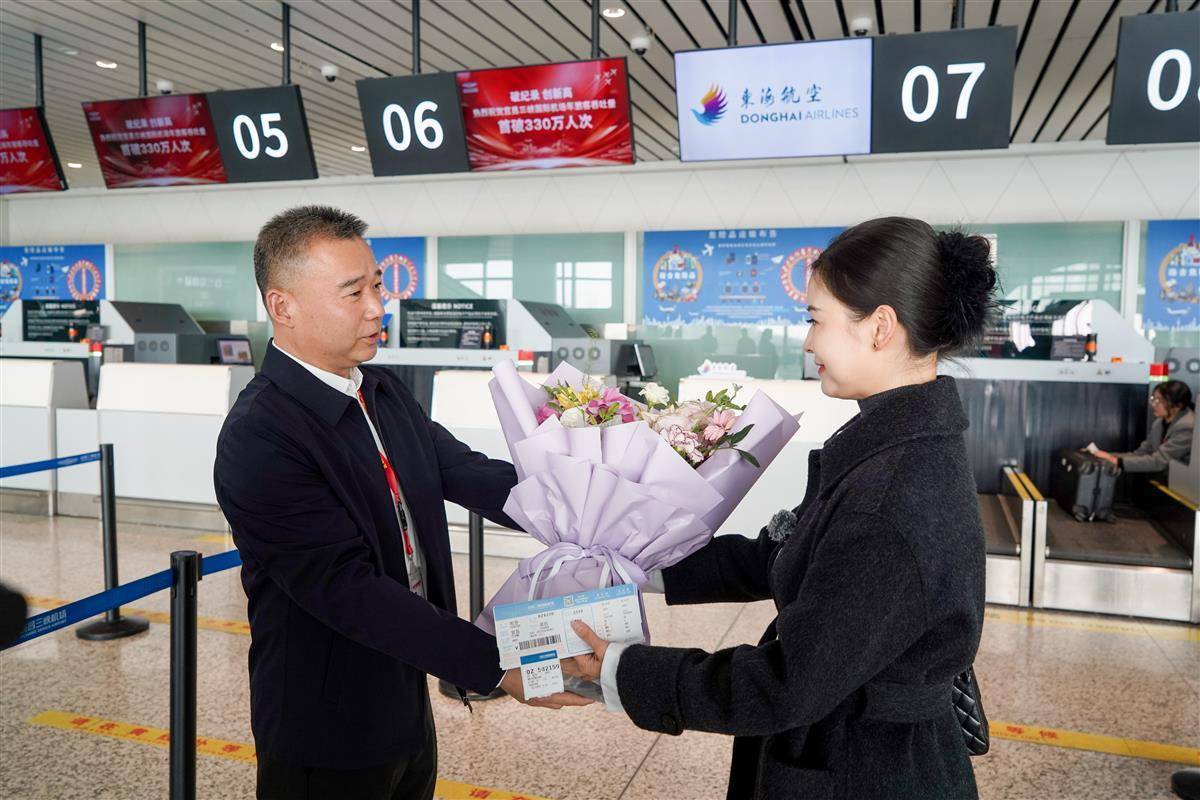 郑芳成为三峡机场2025年度第330万名乘客 (湖北日报通讯员 王婷婷 摄)