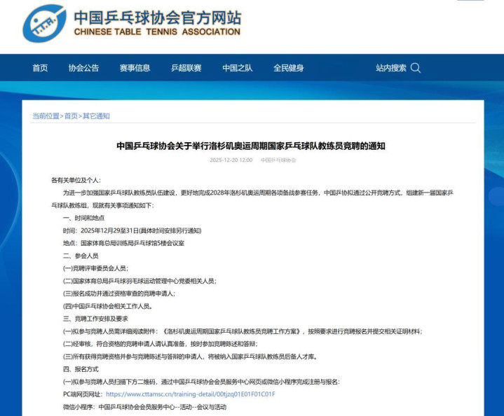 中国乒乓球协会官网于12月20日正式发布了《中国乒乓球协会关于举行洛杉矶奥运周期国家乒乓球队教练员竞聘的通知》,标志着为期三天的新周期国家队教练员公开竞聘工作将于本月29日正式启动。